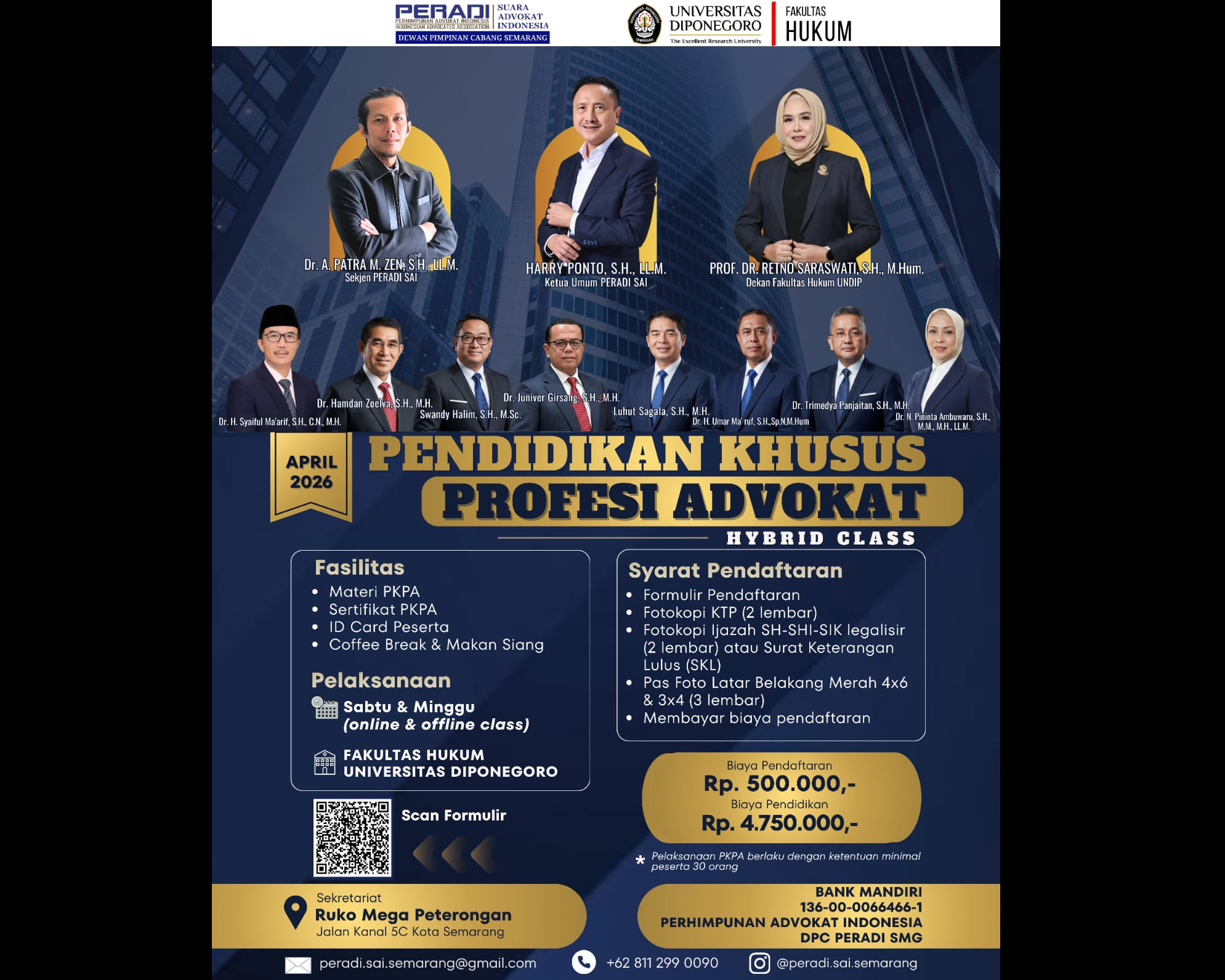 DPC PERADI SAI Semarang bekerja sama dengan Fakultas Hukum Universitas Diponegoro, membuka pendaftaran Pendidikan Khusus Profesi Advokat (PKPA) sampai April 2026.
